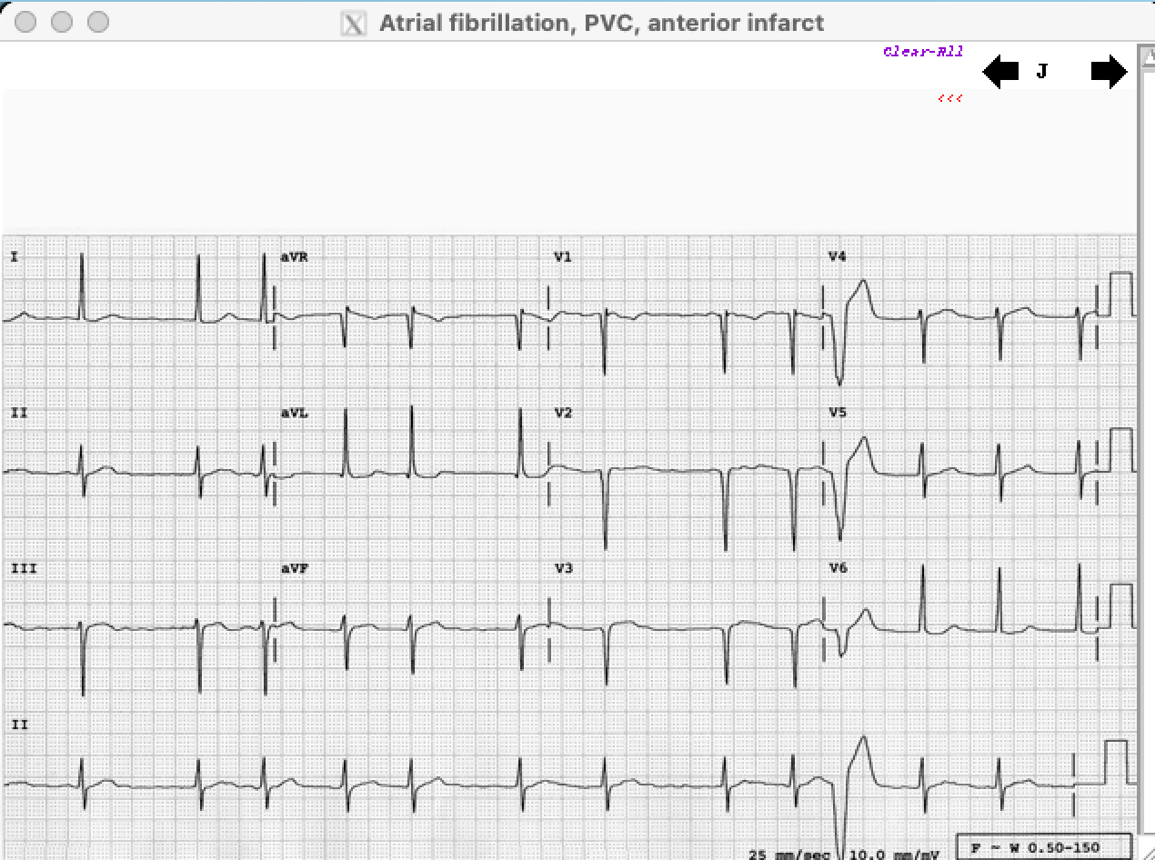 Figure: ECG Atrial fibrillation, PVC, anterior infarct