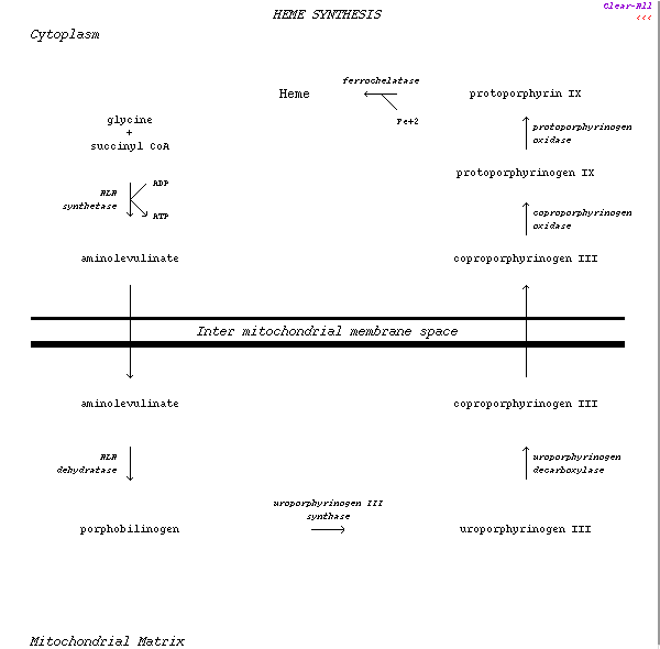 - its synthesis is most pronounced in the bone marrow & liver because of the requirements for incorporation of heme into hemoglobin & cytochromes, respectively